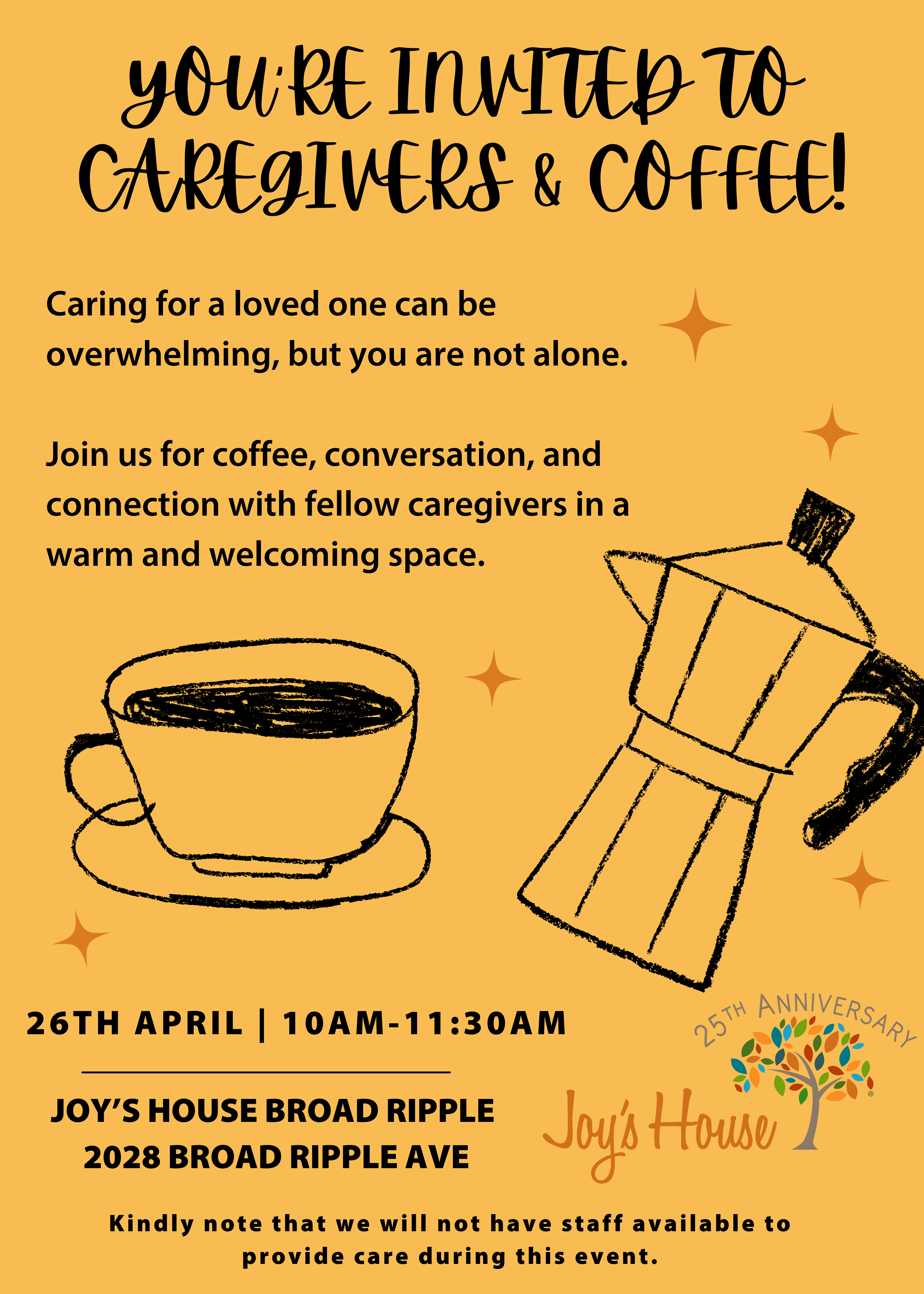 Join us for Caregivers & Coffee! A relaxed morning for connection, conversation, and support. Whether you’re a new caregiver or have been on this journey, you’ll find comfort in being with others who understand.